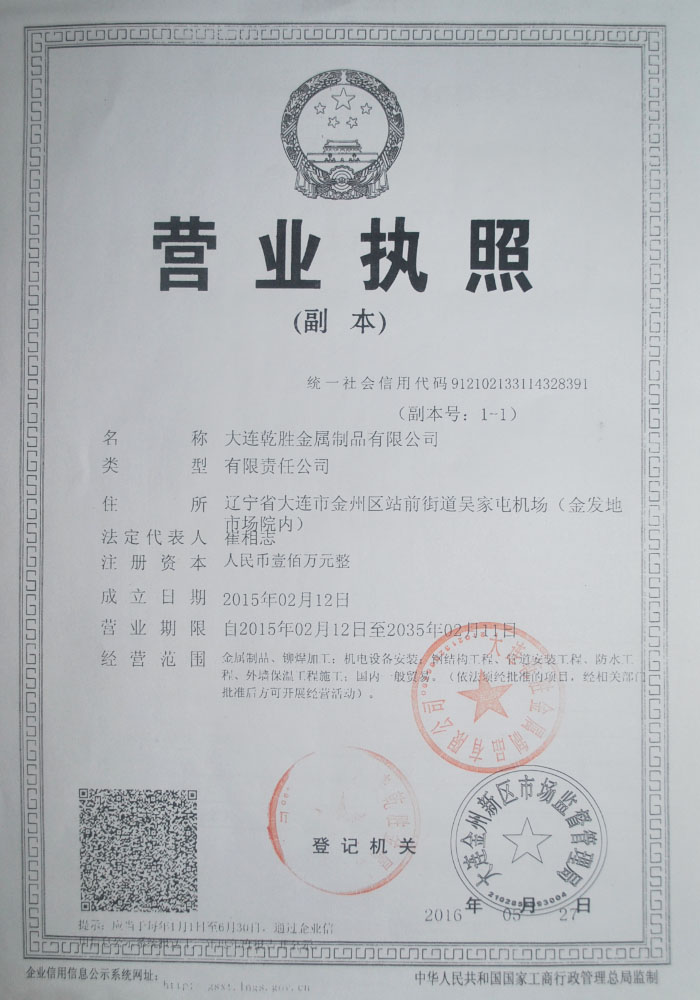 證書介紹 大連乾勝金屬制品有限公司(原大連志誠(chéng)鉚焊金屬制品有限公司),是一家專業(yè)的鈑金加工、激光切割加工、鉚焊加工、機(jī)械加工廠。擁有多臺(tái)德國(guó)通快激光切割機(jī),160噸4米折彎?rùn)C(jī),8*4米剪板機(jī),20*1.6米滾床,電焊機(jī),二氧焊機(jī),交直流氬弧焊機(jī),等離子切割機(jī),鋸床,20車床,30車床,自用門吊等。